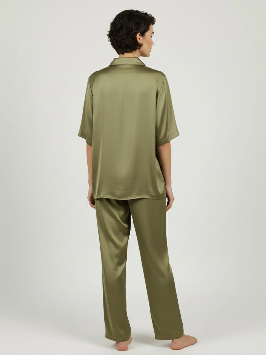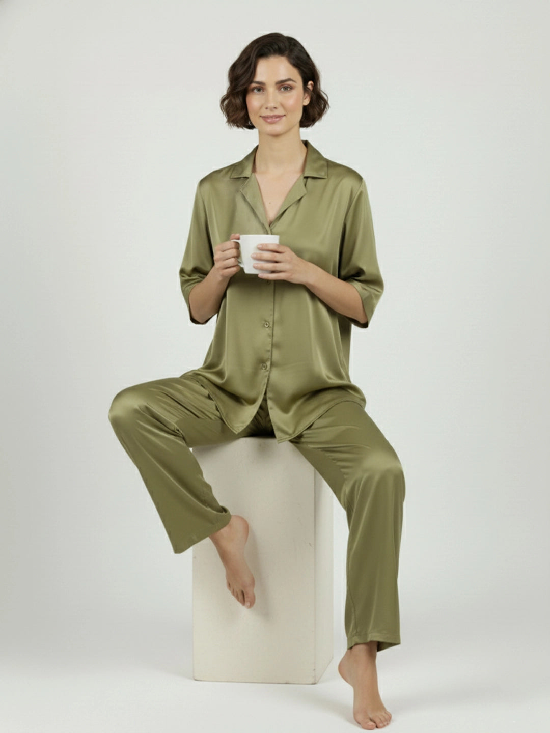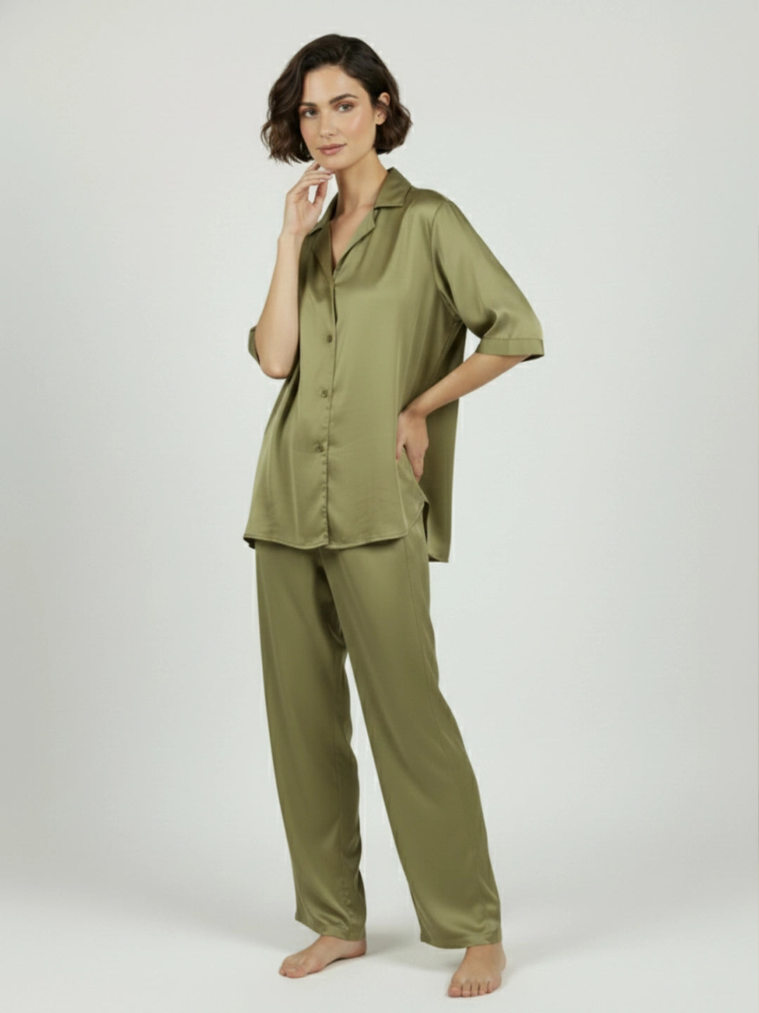 Olive satin notch collar shirt with trouser co-ord set