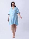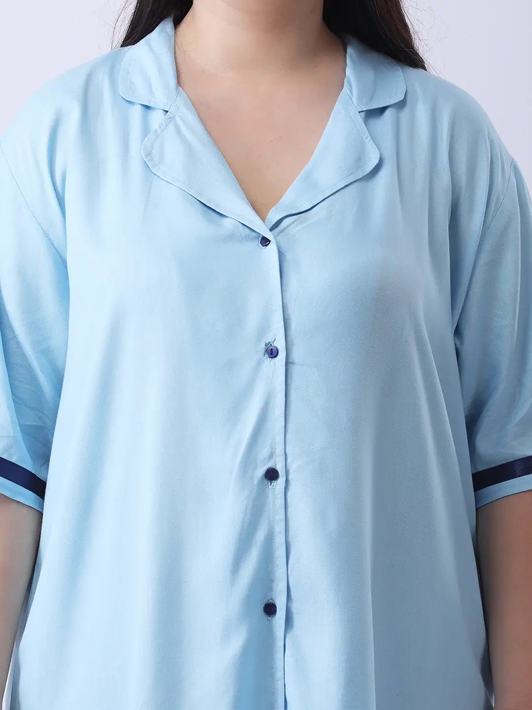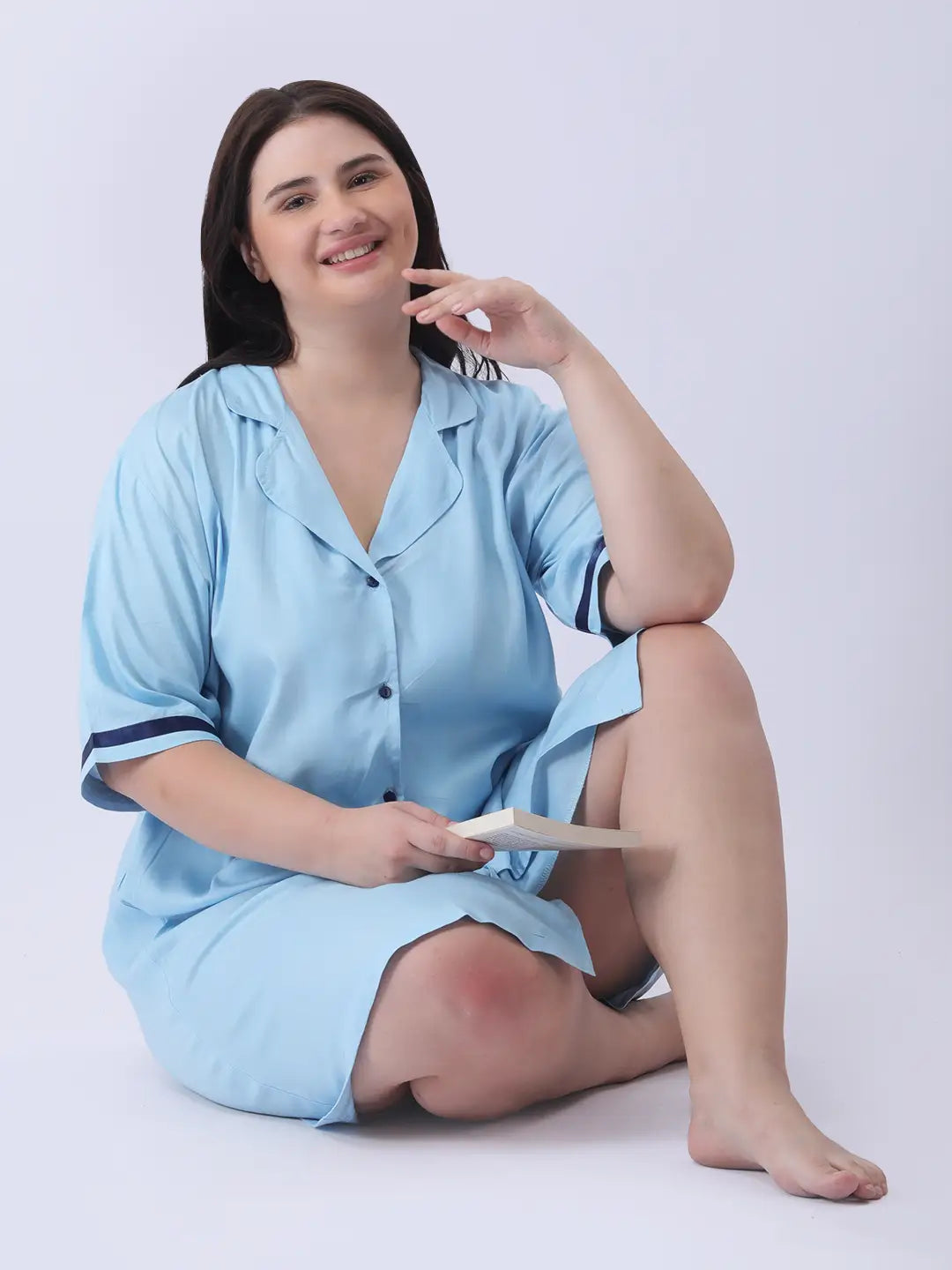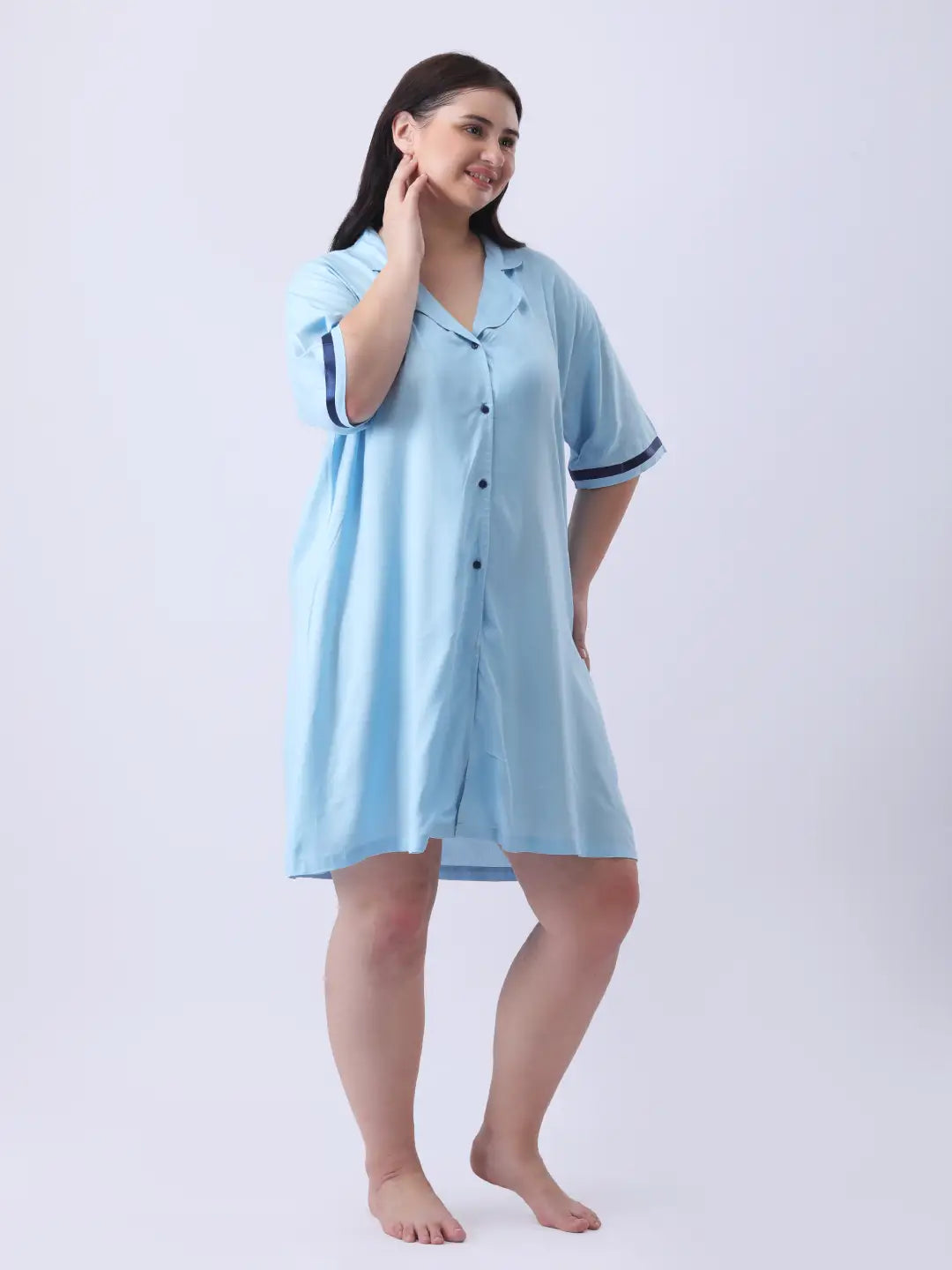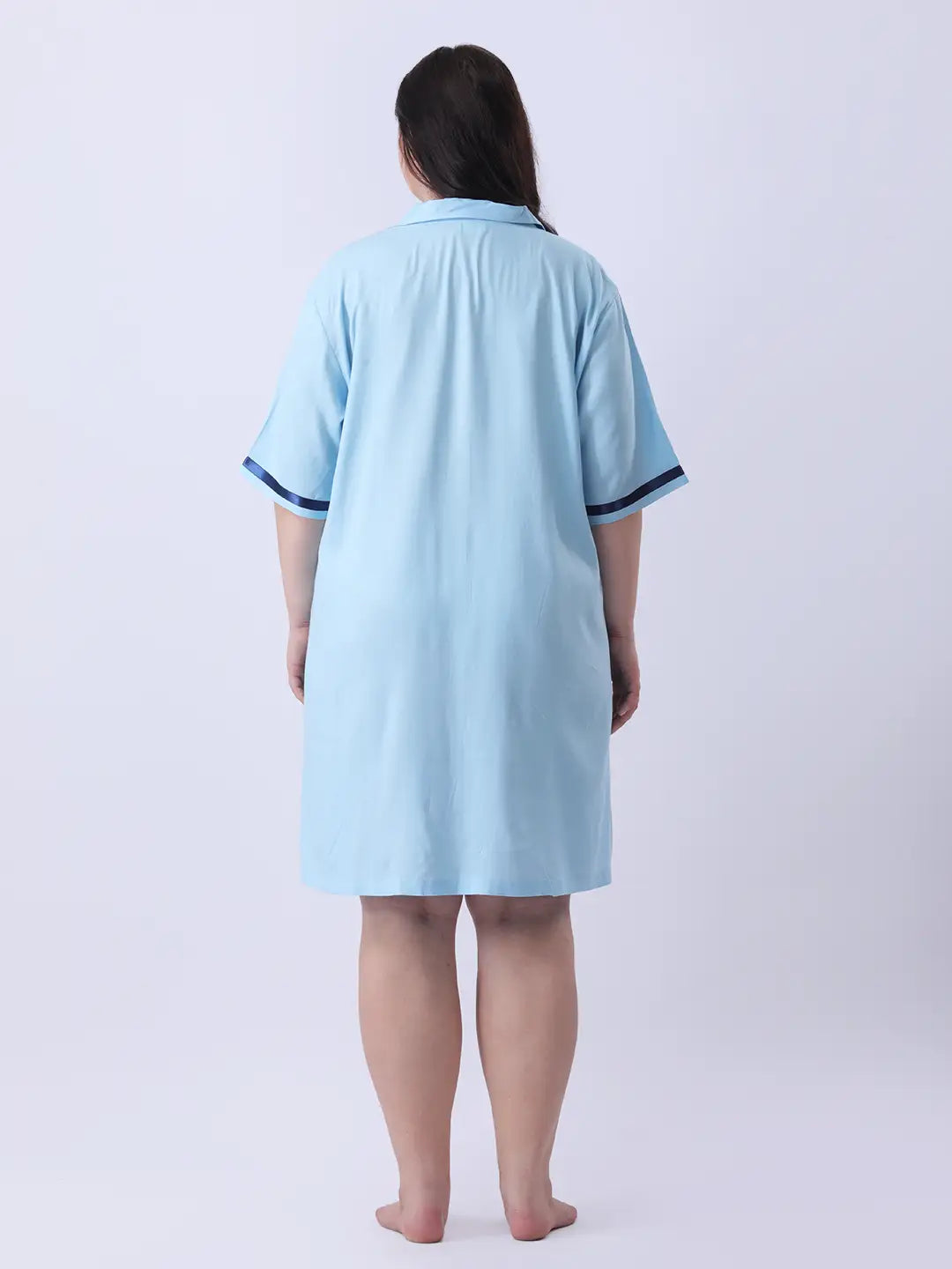 Powder blue rayon shirt dress with ribbon detailing in sleeve