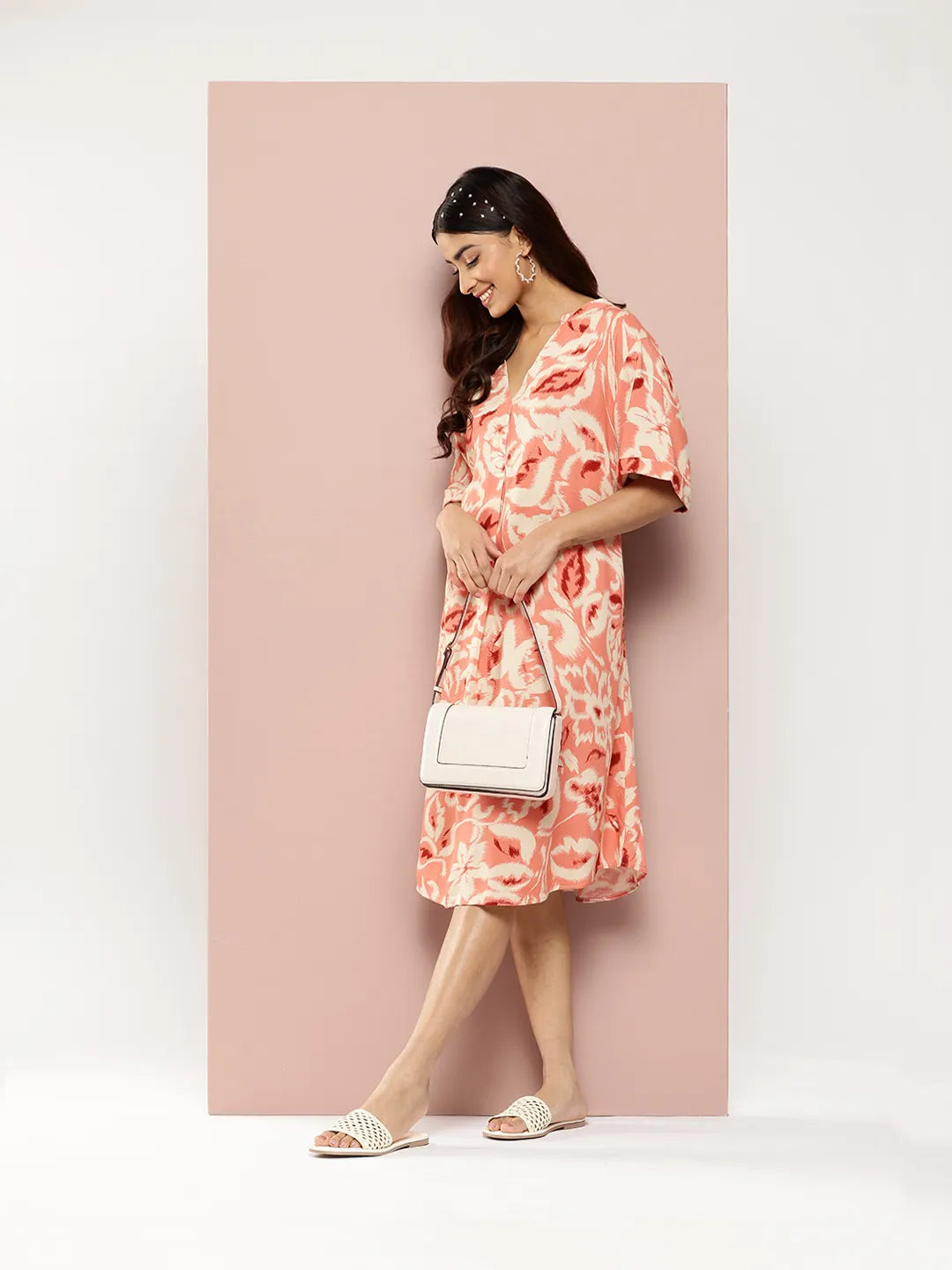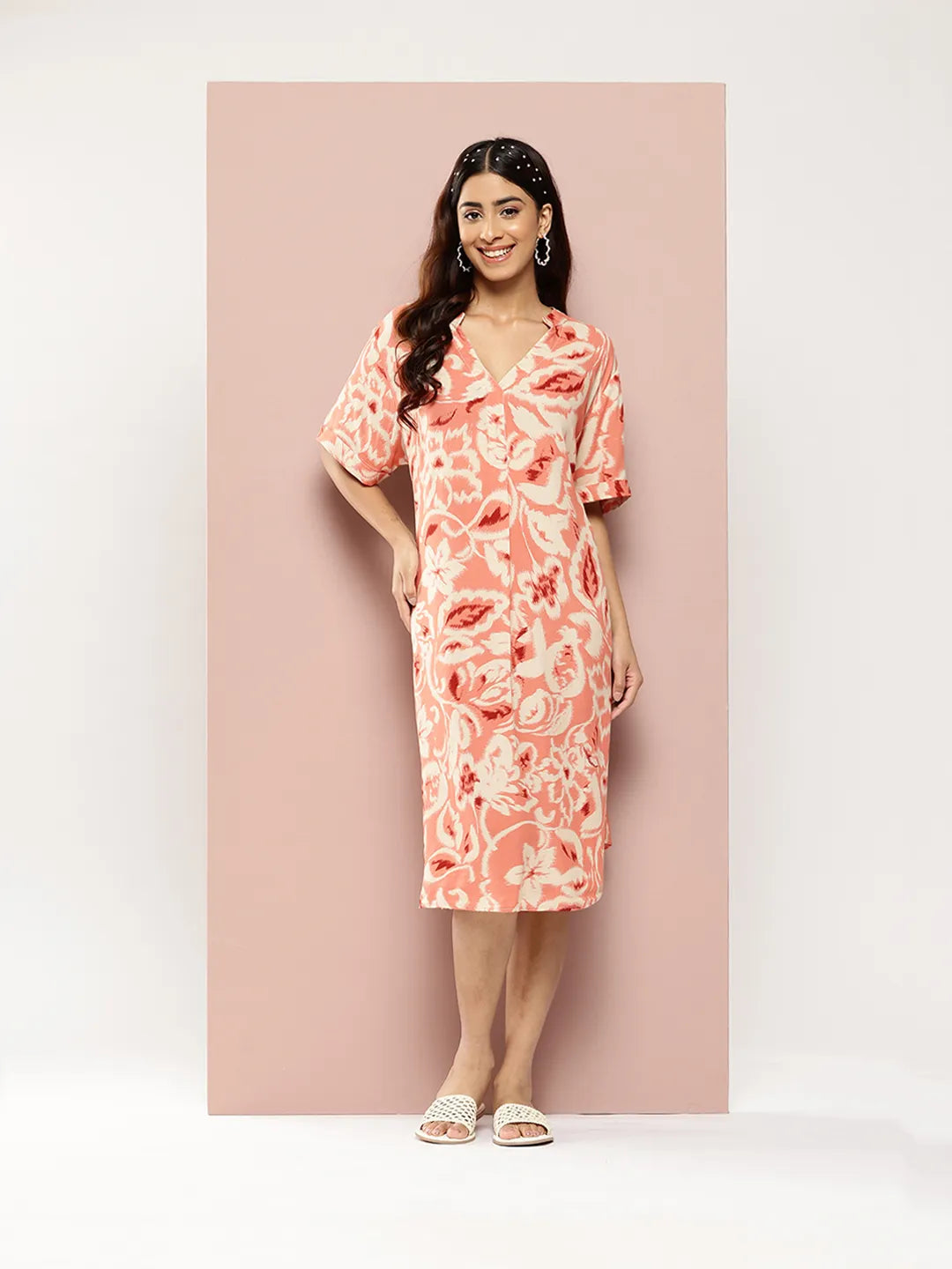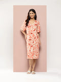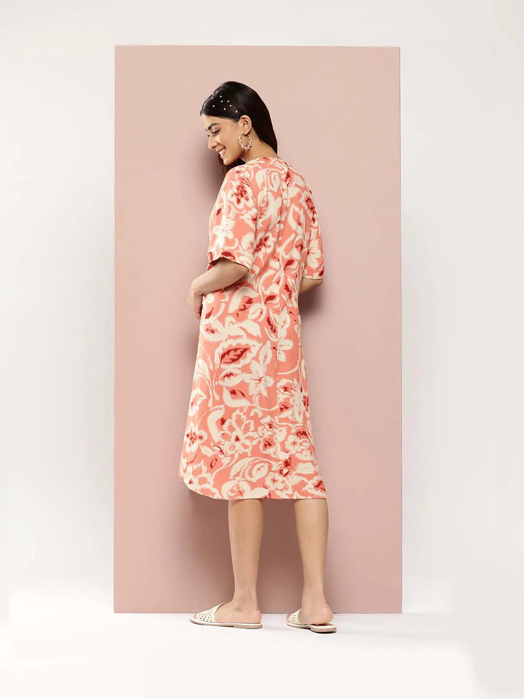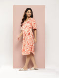 Printed Rayon half-placket mandarin collar calf-length dress