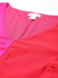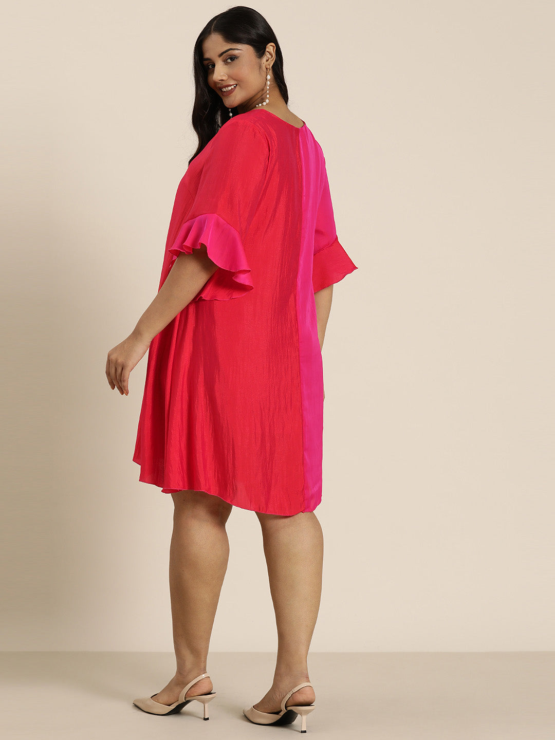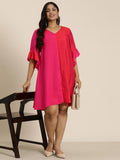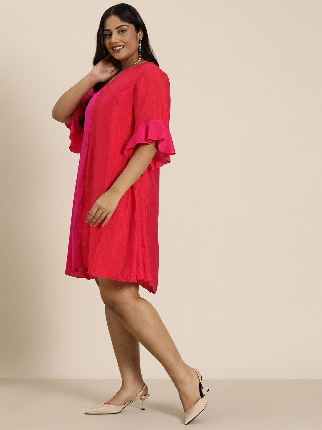 Solid Bright Pink Regular Fit V Neck Three Quarter Bell Sleeve Silk Dress
