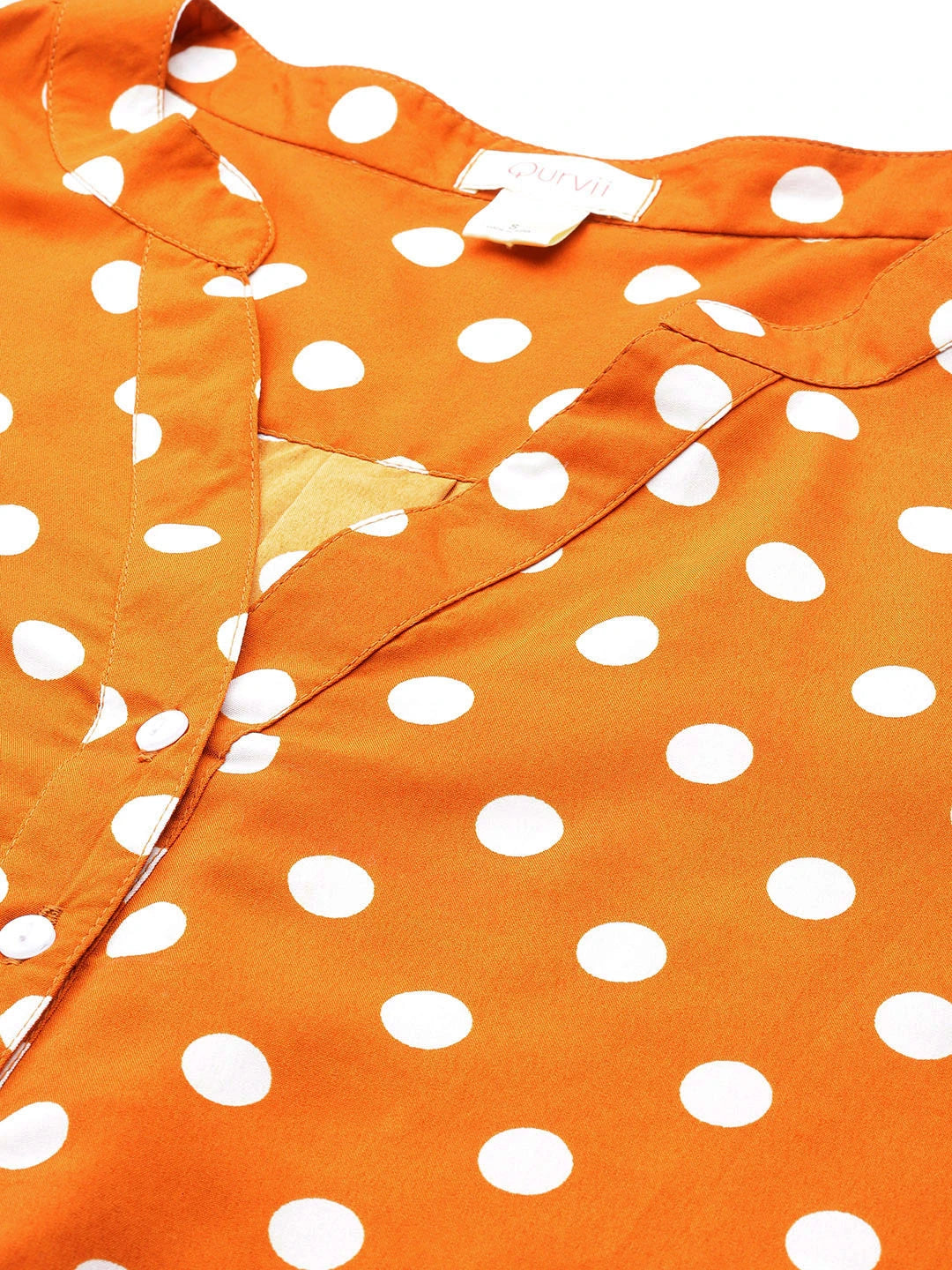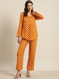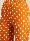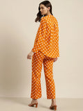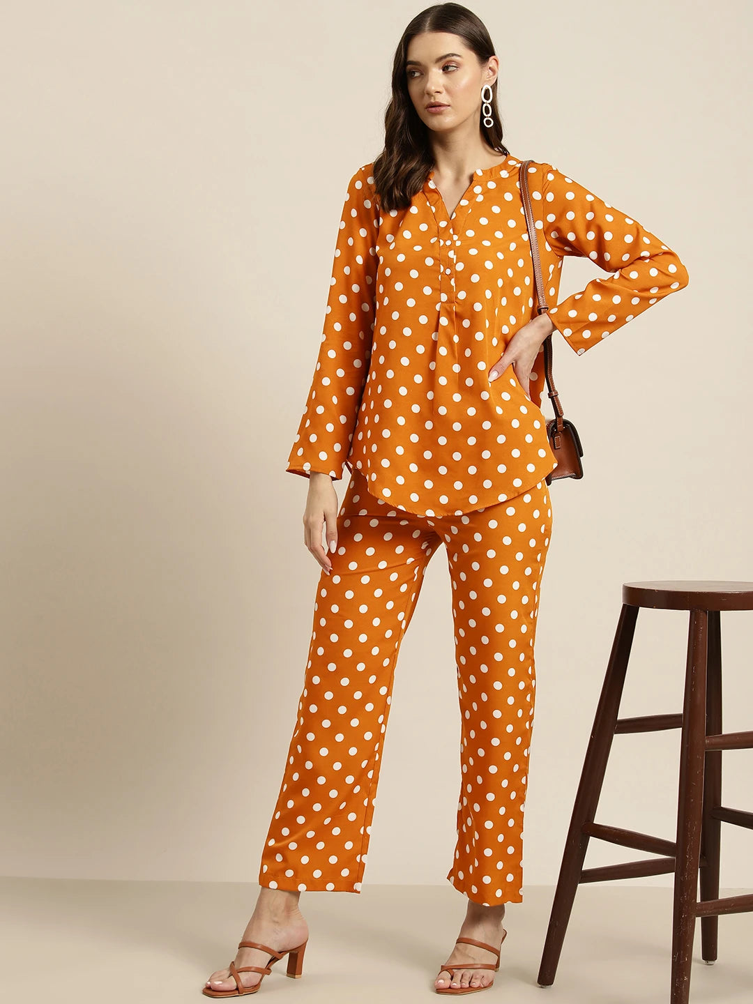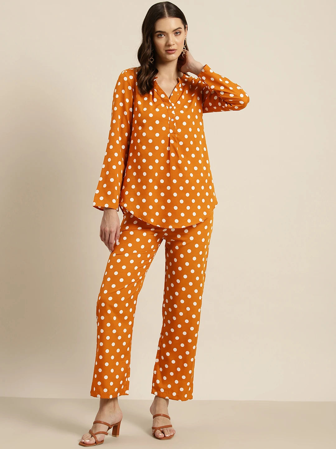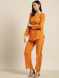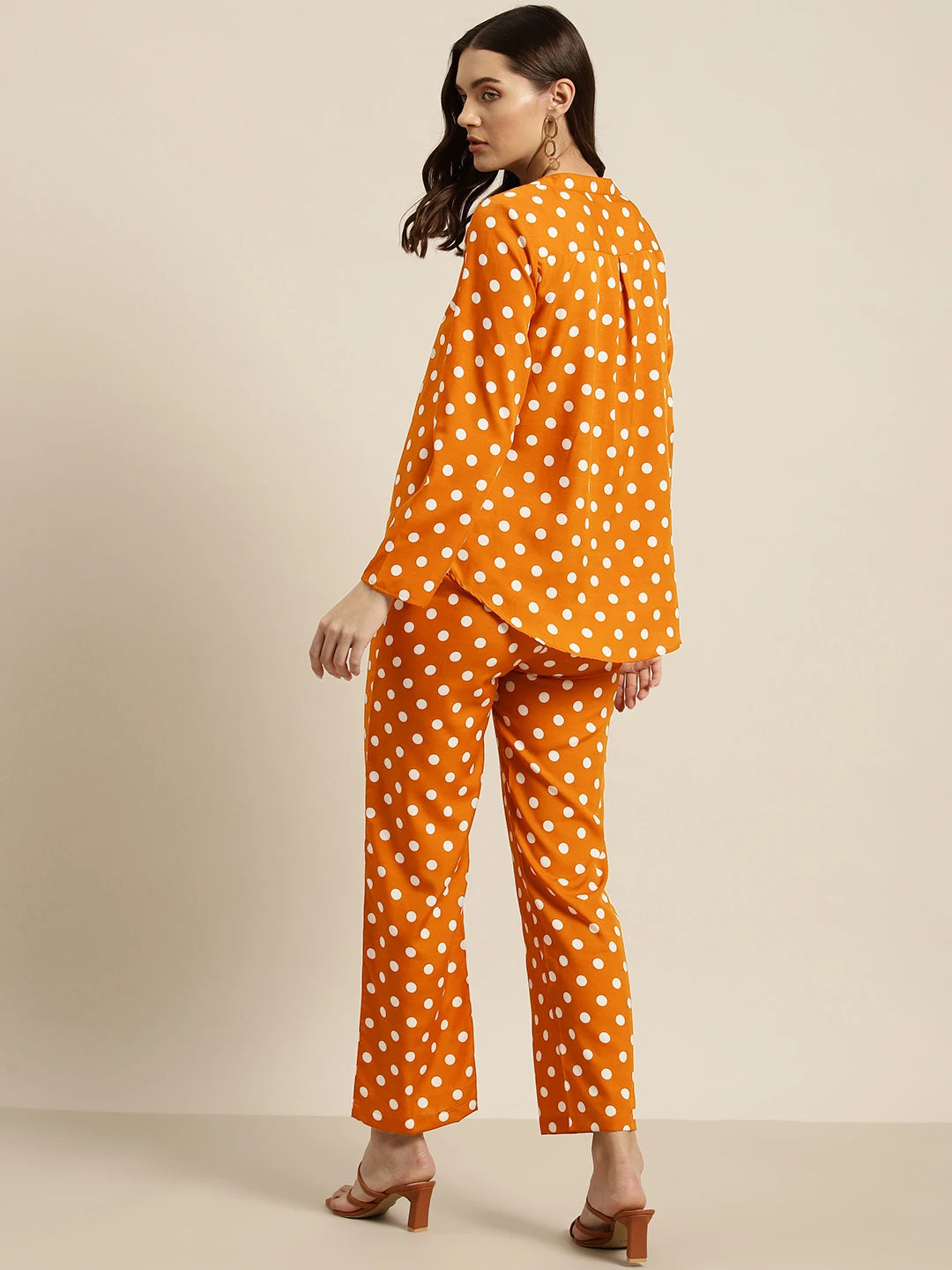 Rust and white polka dot crepe shirt and pant set