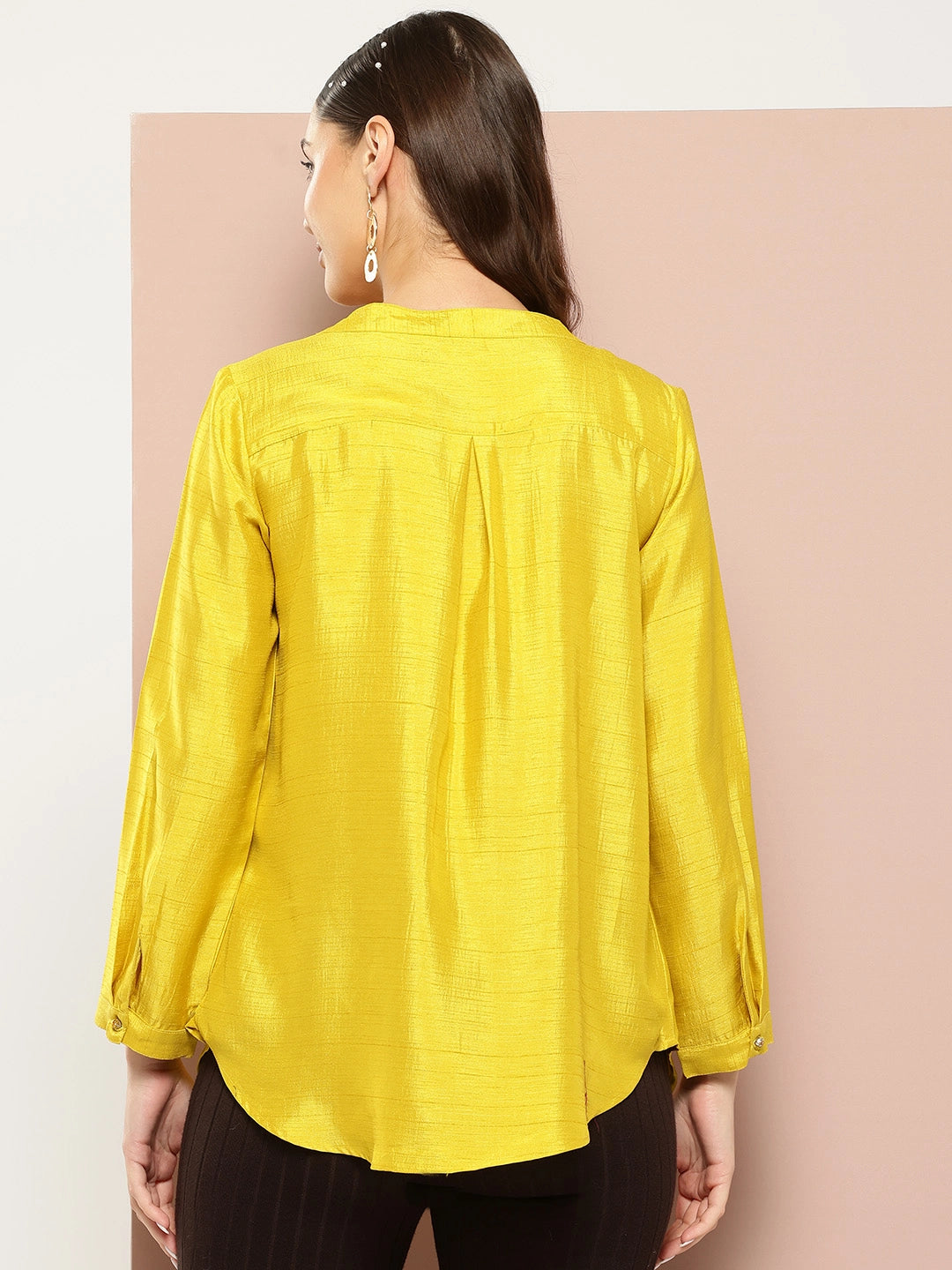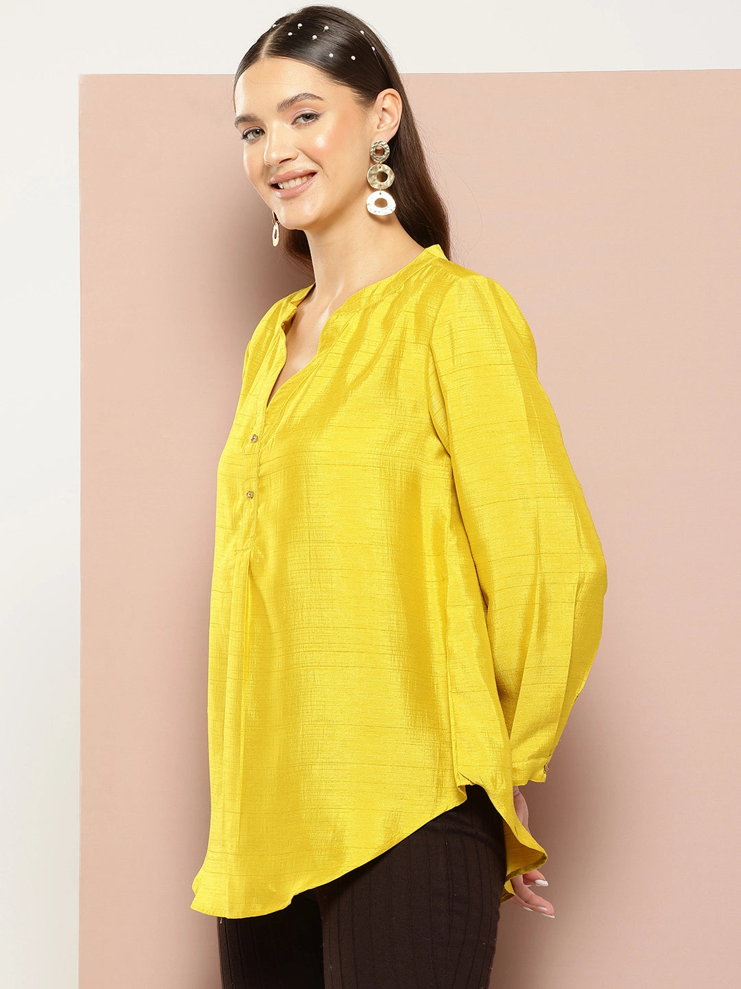 Silk half placket maindarin collar shirt.