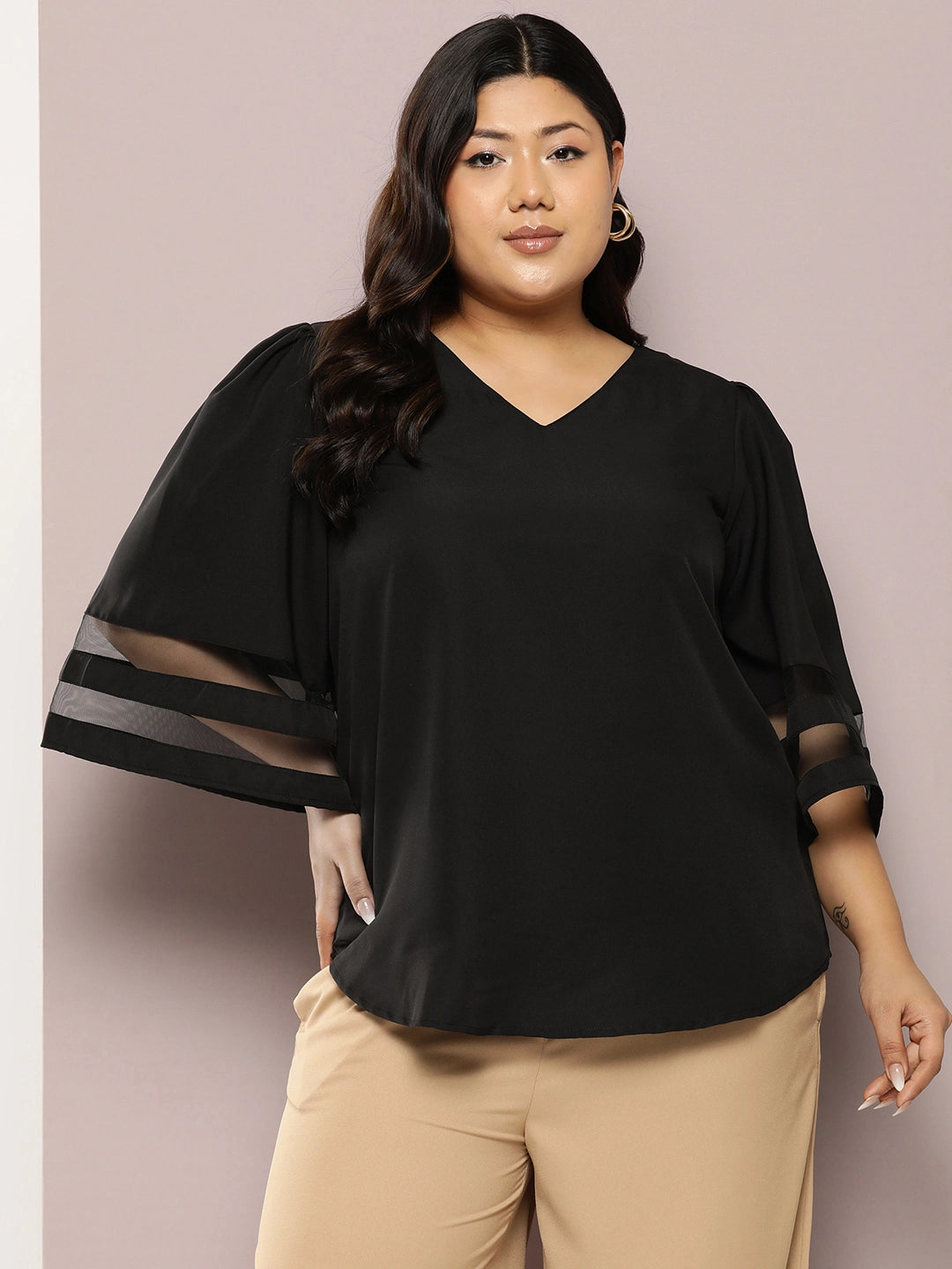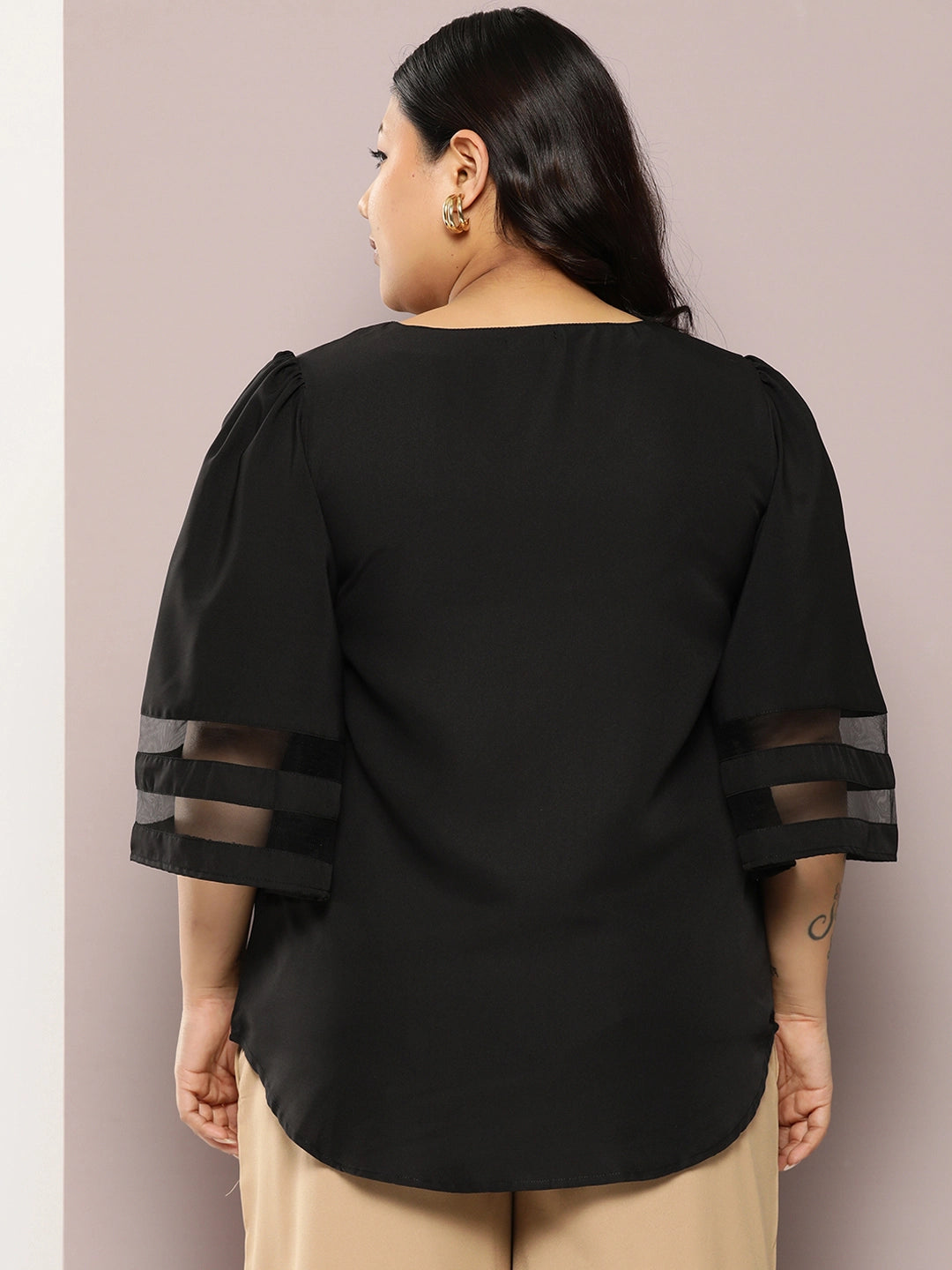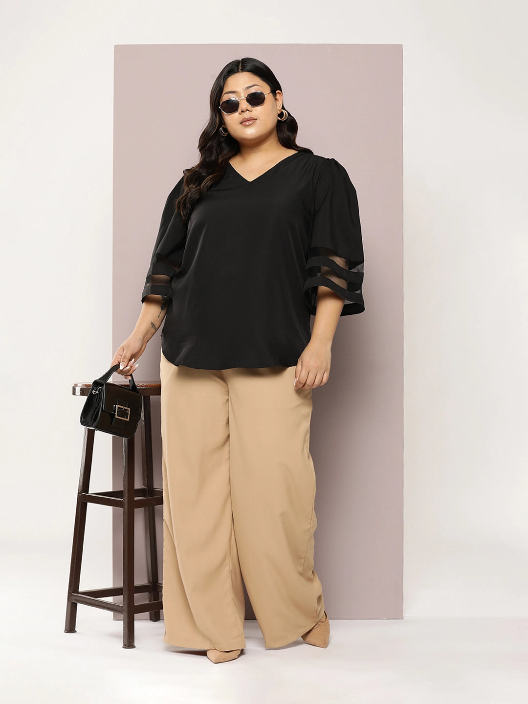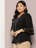 Solid Dark Black Relaxed Fit V Neck Three Quarter Bell Sleeve Crepe Top